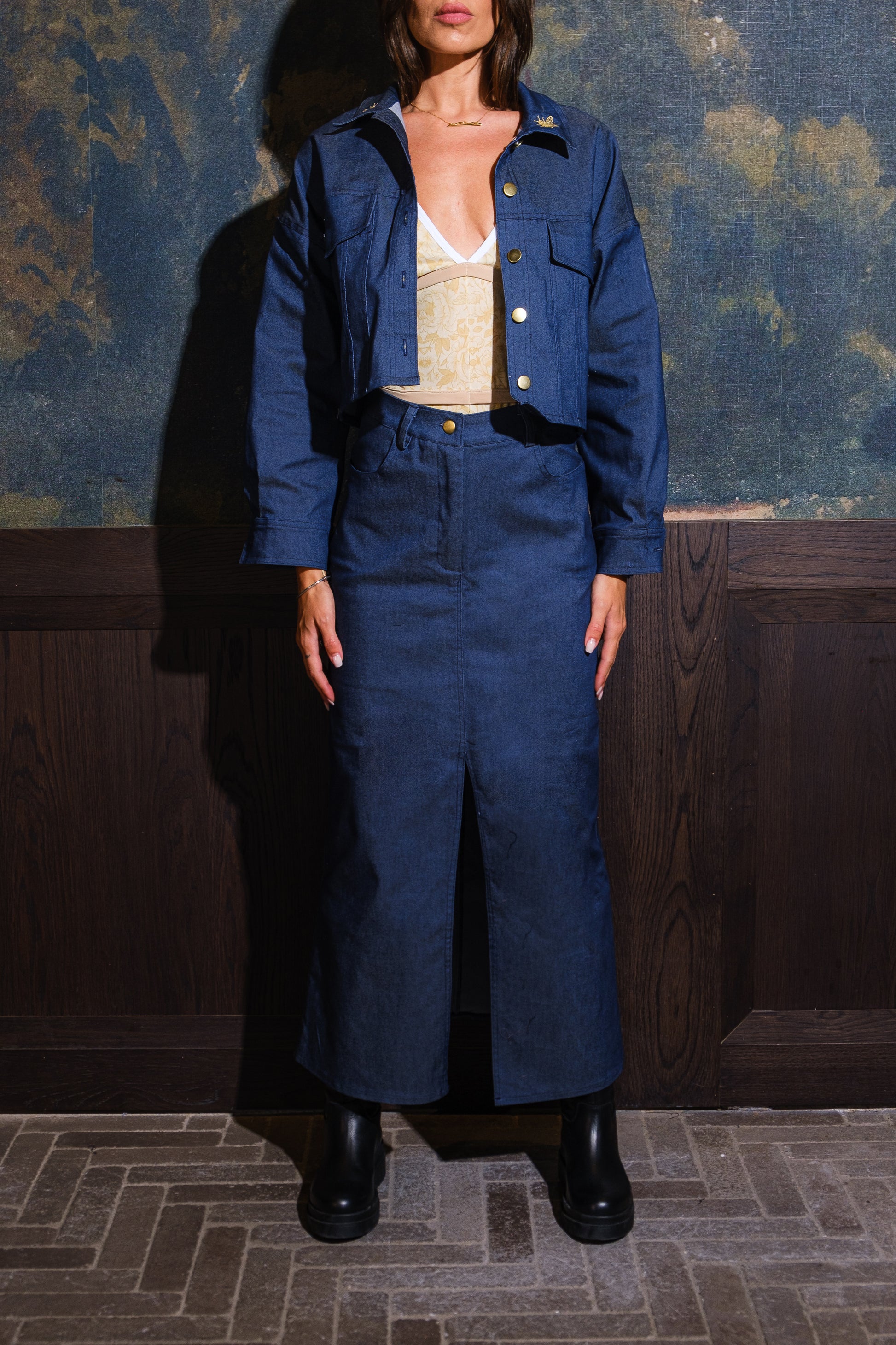 The Blue Jean Skirt is a timeless piece that blends the comfort of stretch denim with the elegance of a maxi silhouette.