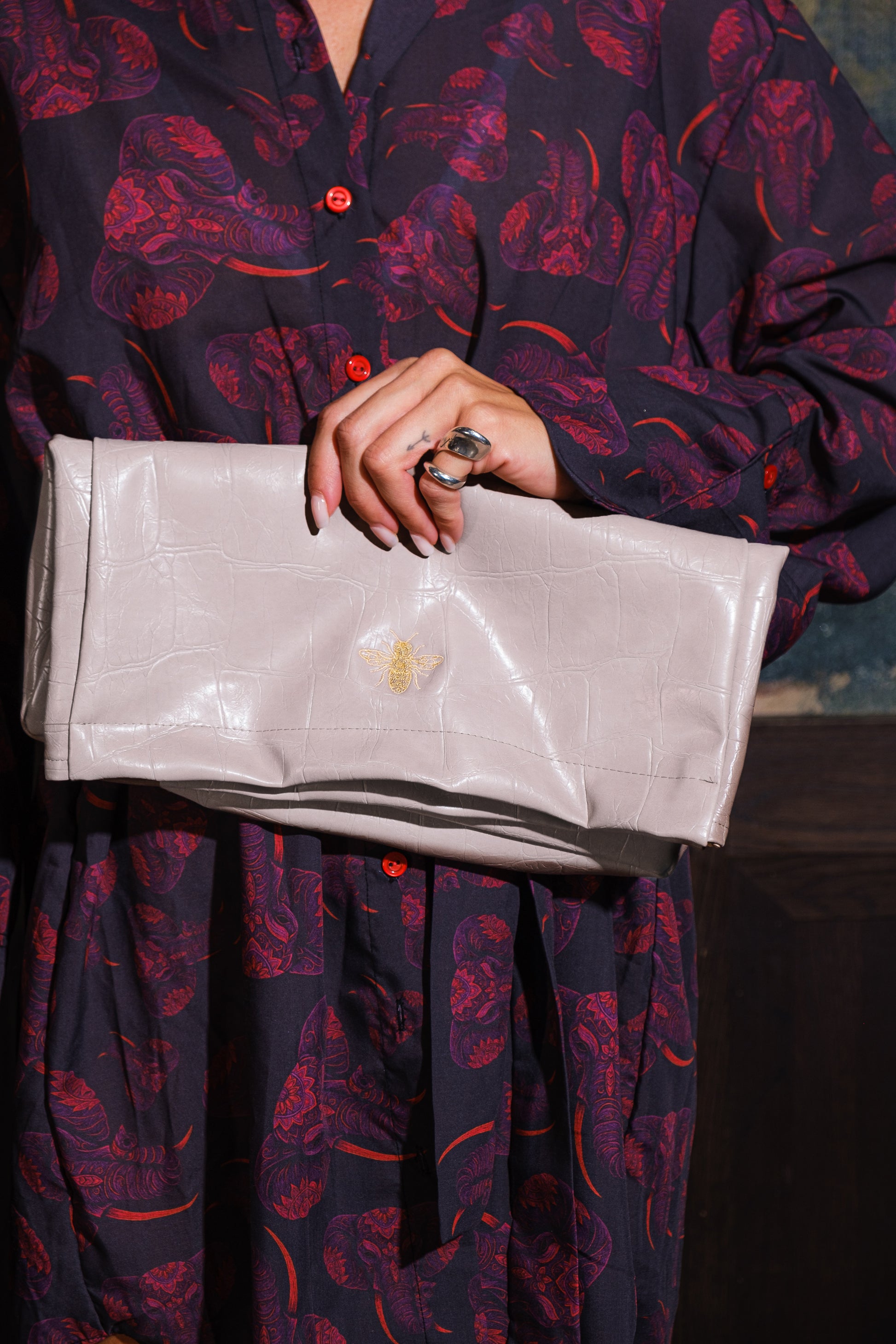 Στο εσωτερικό διαθέτει δύο μαγνήτες για ασφαλές κλείσιμο και ένα διακριτικό κέντημα με χρυσοκλωστή που αποτυπώνει το logo της συλλογής, προσθέτοντας μια διακριτική νότα πολυτέλειας.
