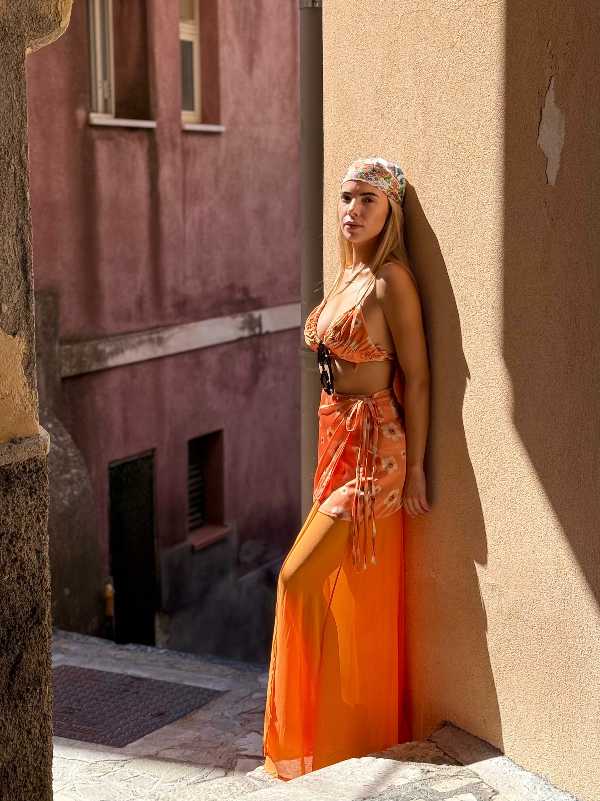 The satin features our custom-designed ibiscus print, created exclusively by our team, while the sheer mousseline overlay adds graceful movement and depth. With a wrap silhouette that ties with soft straps, it adapts perfectly to your body and offers a flattering, adjustable fit.