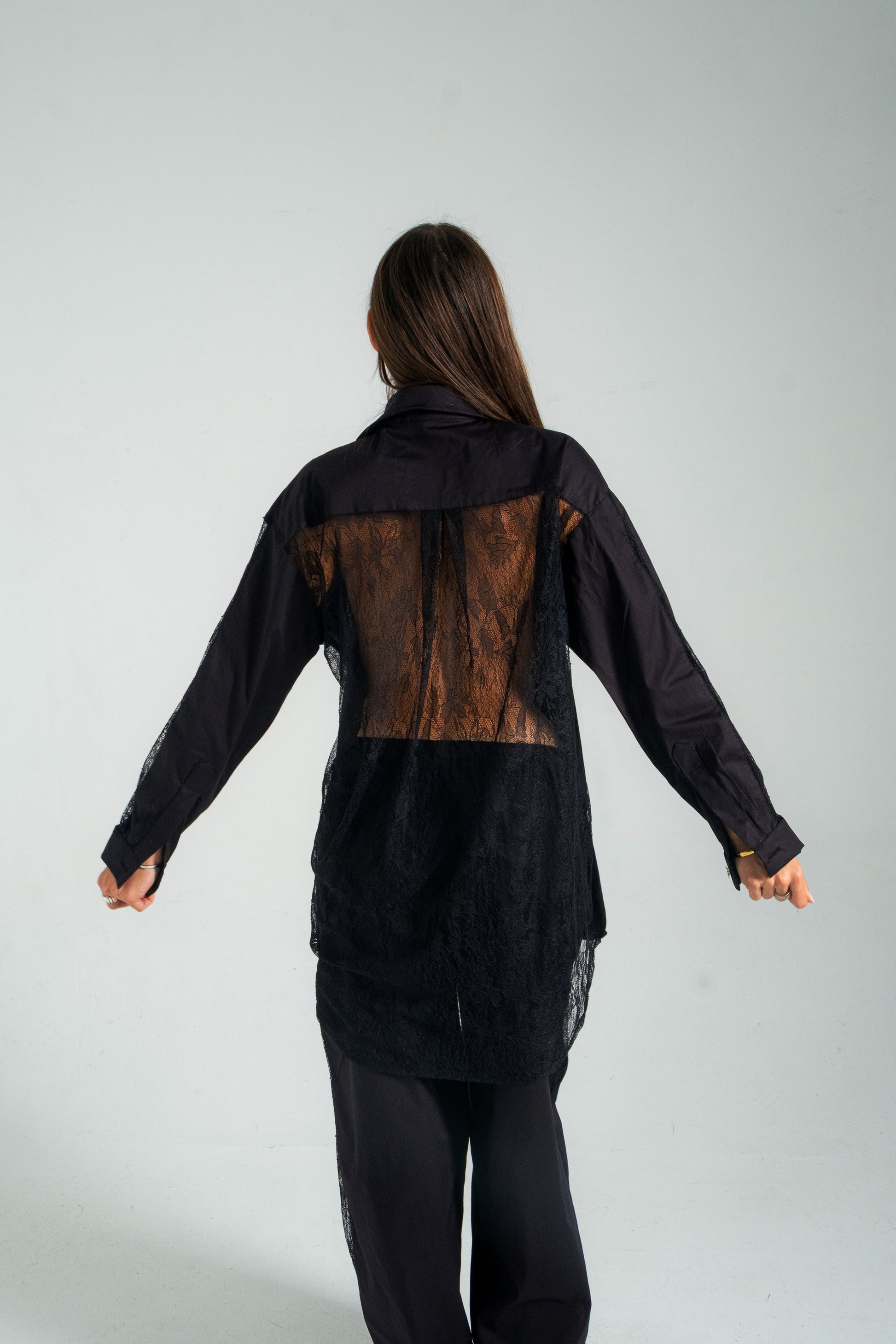 Η μαύρη ημιδιαφανής δαντελένια λωρίδα στο πλάι, που εκτείνεται σε όλο το μήκος του ποδιού, δημιουργεί μια αισθησιακή αλλά εκλεπτυσμένη αντίθεση υφών, αναδεικνύοντας τη γραμμή του παντελονιού.