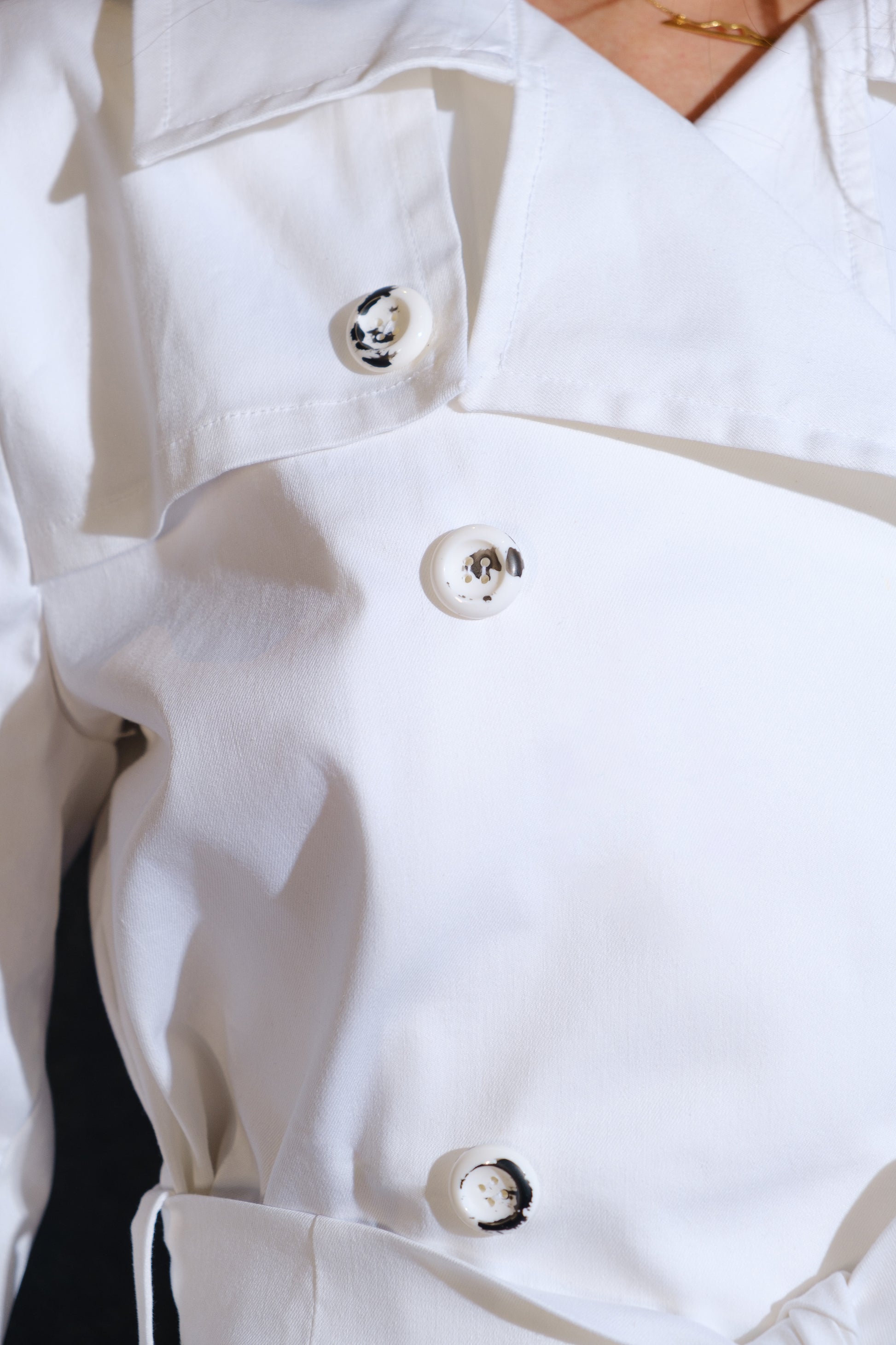 The top part is inspired by a classic trench coat, featuring a cross-over front with four hand-painted buttons in a distinctive cow-print design — a playful yet sophisticated touch that makes it stand out.